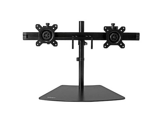 VESA 75x75/100x100mm free standing dual monitor stand for displays up to 24IN (18lb) - Height adjustable 25IN crossbar with +/-15degree monitor tilt/swivel & 360 rotation - Silver aluminum desktop monitor mount arm w/ low-profile base and Cable management.